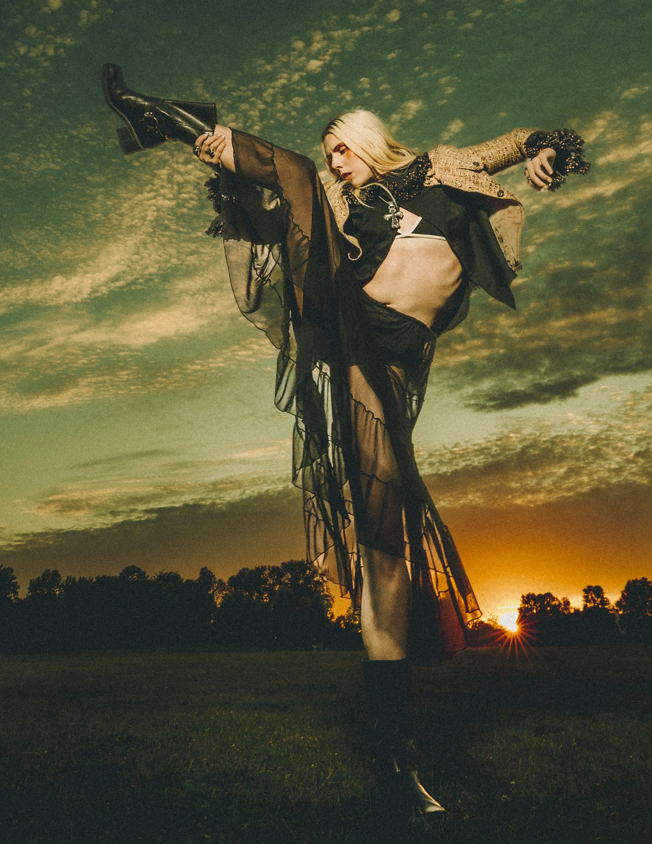 Kaylin has a way of going all in, and this moment was no exception. Power, elegance, and attitude all collide here, captured in a single breath where movement meets fashion. I love the mix—the strength of her form, the drama of the outfit, and the backdrop of the fading sun pulling it all together.